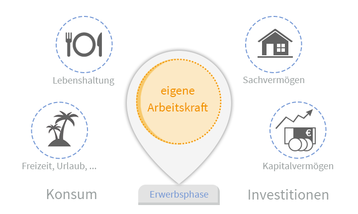 - Die Einnahmen zur Gestaltung des finanziellen Lebens in der Erwerbsphase stammen typischerweise aus der eigenen Arbeitskraft.