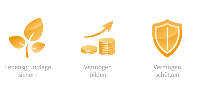Aus den drei Vermögensklassen Arbeitskraft, Kapitalvermögen und Sachvermögen leiten sich die drei folgenden finanziellen Bedürfnisse ab, die über den Lebenszyklus zu beachten sind: