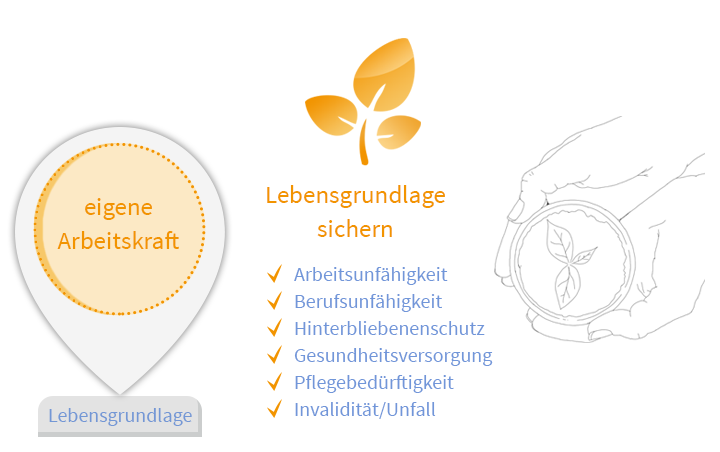 Die Risiken, die zu einer nicht gewollten oder nicht verkraftbaren Minderung der Einnahmen führen, sind solche, die den Vermögensspeicher Arbeitskraft als Quelle der Einnahmen gefährden. Das betrifft typische Handlungsfelder wie die Arbeitsunfähigkeit oder die Berufsunfähigkeit und bei Familien den Todesfall und damit die Absicherung der Hinterbliebenen.